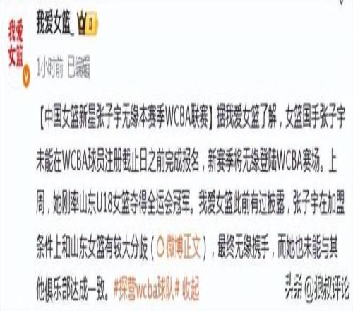 北京时间11月19日,根据媒体人“我爱女篮”的报道,女篮国手张子宇未能在WCBA球员注册截止日之前完成报名,新赛季将无缘登陆WCBA赛场。