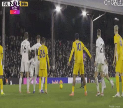第90+2分钟,哈里-威尔逊任意球直接破门,富勒姆2-1布莱顿