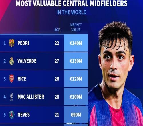 德转列中前卫身价榜:佩德里1.4亿欧居首,巴尔韦德第二 -